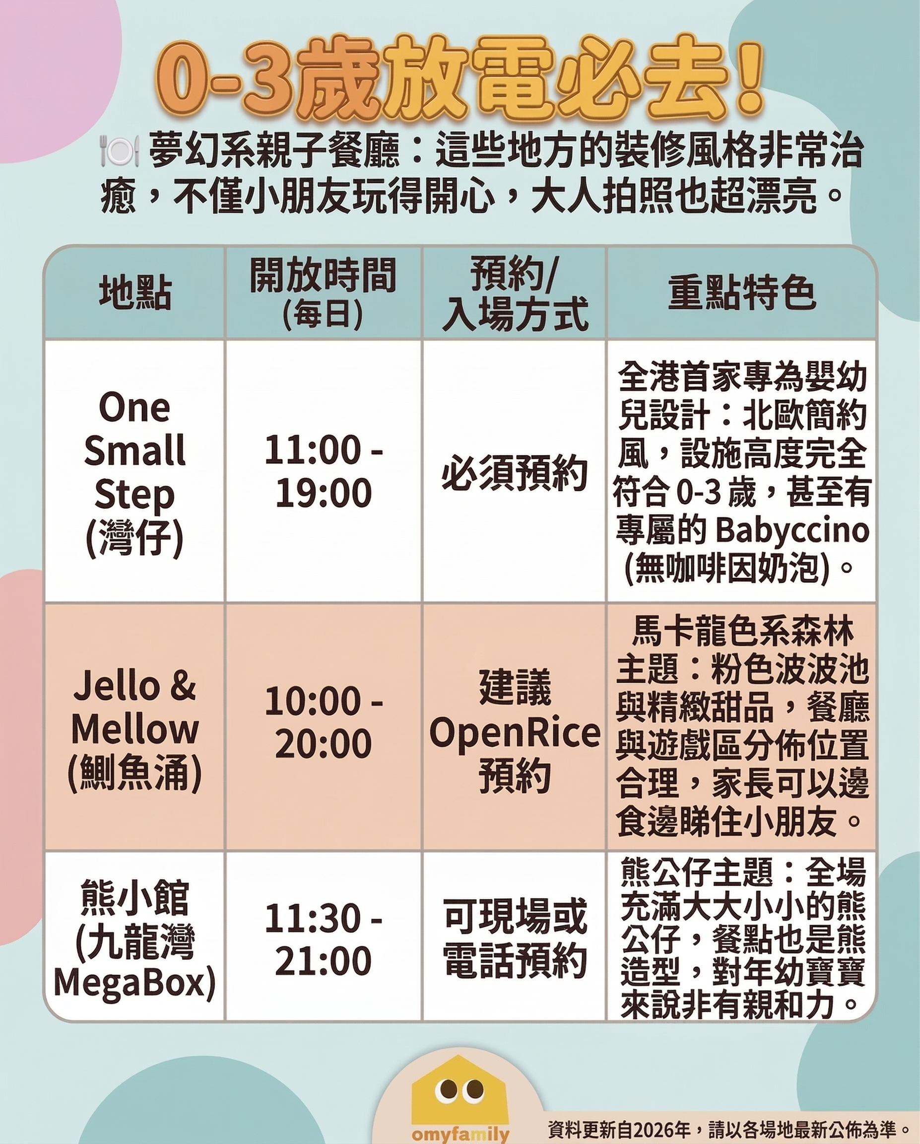 🍽️ 【親子餐廳】大人歎茶: ✅ One Small Step (灣仔) 設施啱晒寶寶。 ✅ 熊小館 (MegaBox) 餐點好可愛,熊公仔主題。