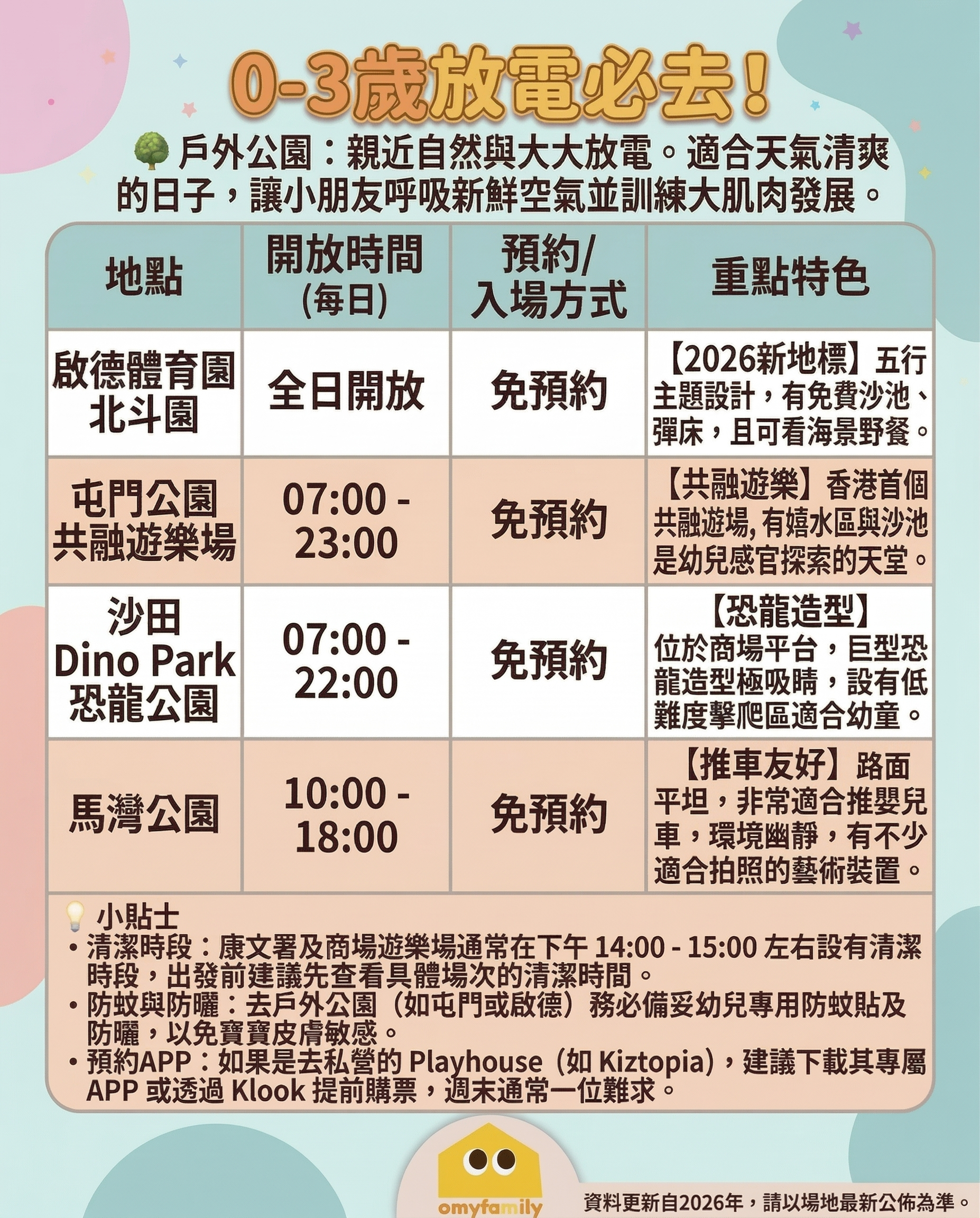 🌳 【戶外/公園】大草坪野餐: ✅ 啟德體育園北斗園 (2026新地標),有免費沙池同海景。 ✅ Dino Park 恐龍主題,攀爬區難度啱啱好。