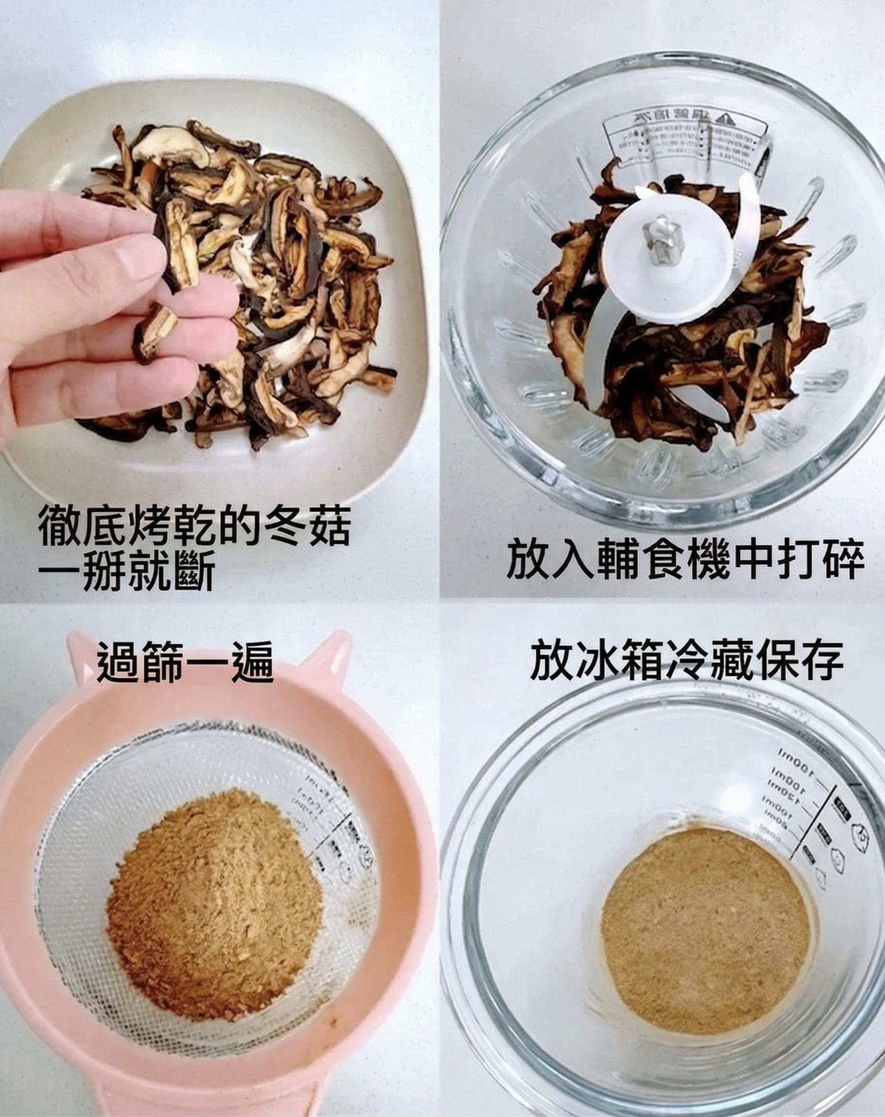 5️⃣ 打粉: 焗乾咗嘅冬菇要等完全放涼先放落輔食機打碎(未涼晒就打會容易回潮變軟)。