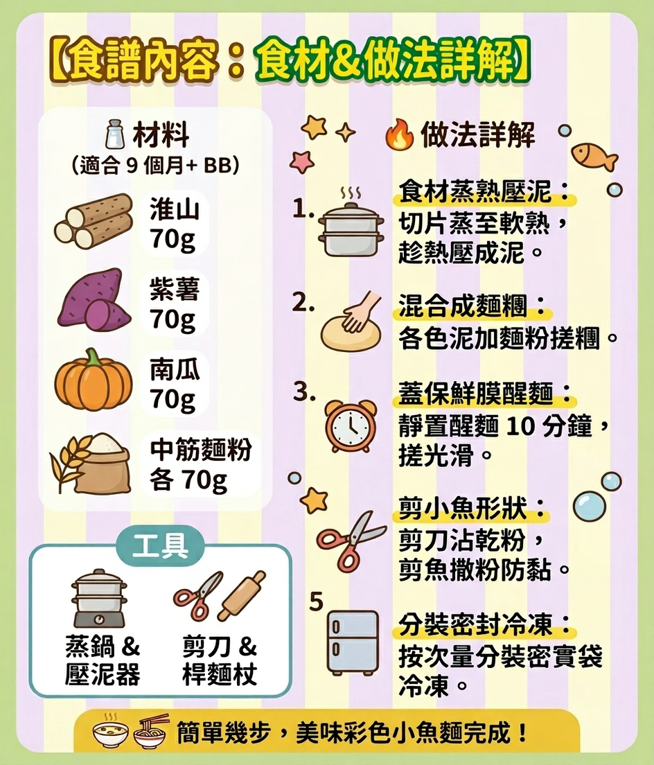 各位媽媽們注意啦🥰✨ 自製輔食最驚就係好麻煩,一整就要整好多,但係一放又驚唔新鮮。今日同大家分享呢款超簡易嘅「彩色小魚麵」🐟(材料簡單、步驟少),其實只要跟足呢套全方位保存方法,你就可以一次過做多啲,凍咗就隨時攞出嚟食❄️,好方便又慳時間!