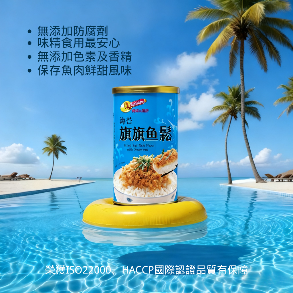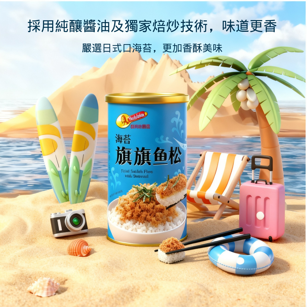 • 成分特色:旗魚肉/海苔/大豆油焙炒/純釀醬油