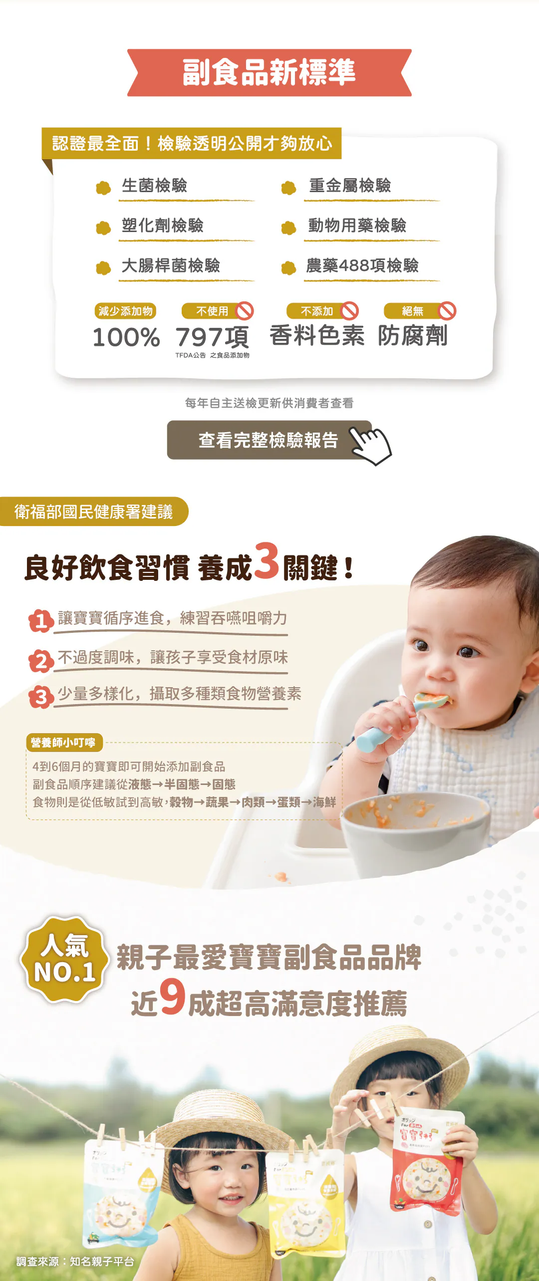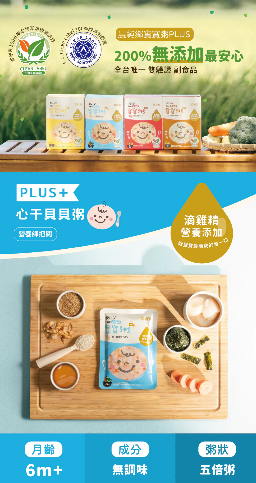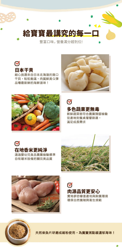 嚴選來自北海道的進口干貝,搭配100%台灣契作香米、紅蘿蔔、柴魚、海苔等,完美呈現自然的海洋風味及營養,純天然、無添加,給寶寶最安心的副食品。