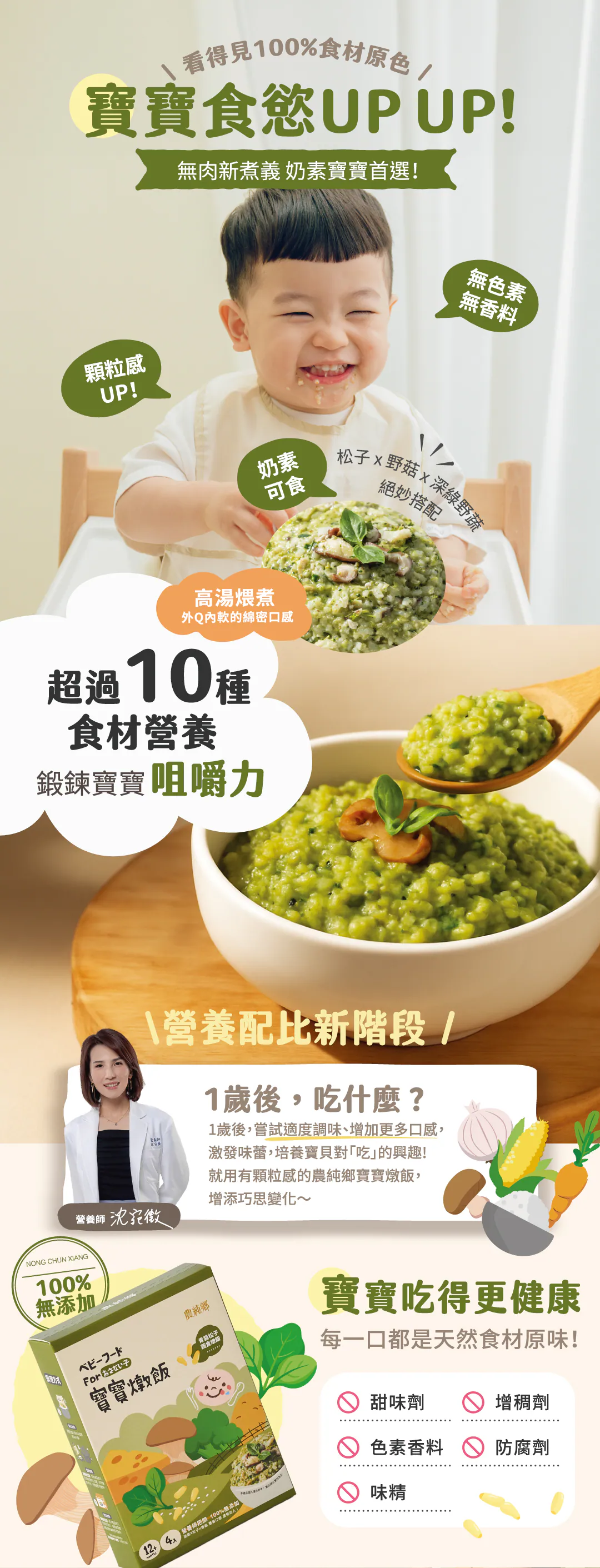 挑剔味蕾都會俾呢款 青醬松子蔬菜燉飯 征服! 濃香綿密、食材原色睇得見,專為寶寶設計嘅健康蔬食新選擇。 使用 新鮮松子 × 台灣在地野菇 × 深綠鮮蔬,滿滿天然營養,無添加防腐劑、香料、甜味劑,BB 食得開心又安心~