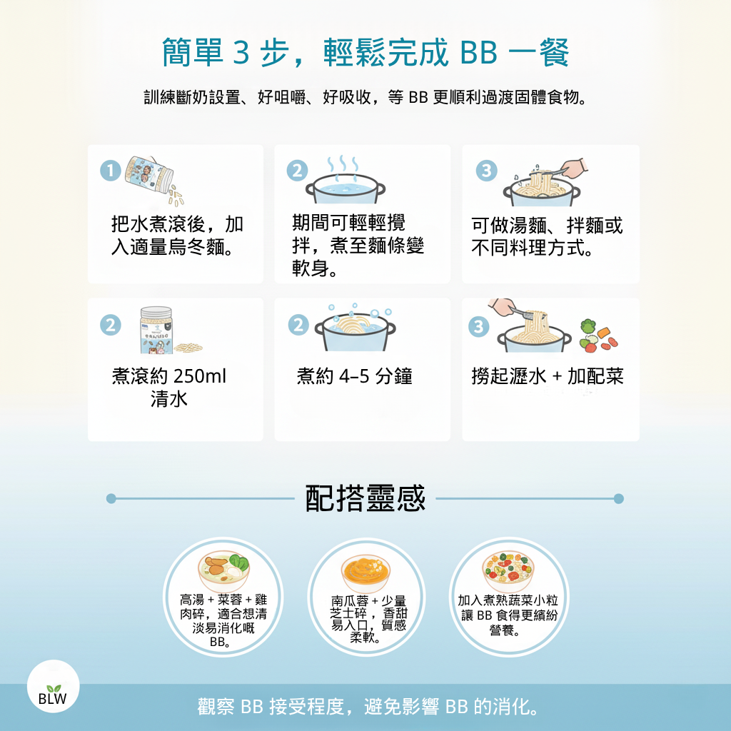 煮食方法:將麵條放入250毫升滾水中,煮約4-5分鐘後起鍋,並加入各式的配菜,可用於拌麵、涼麵、湯麵等等。