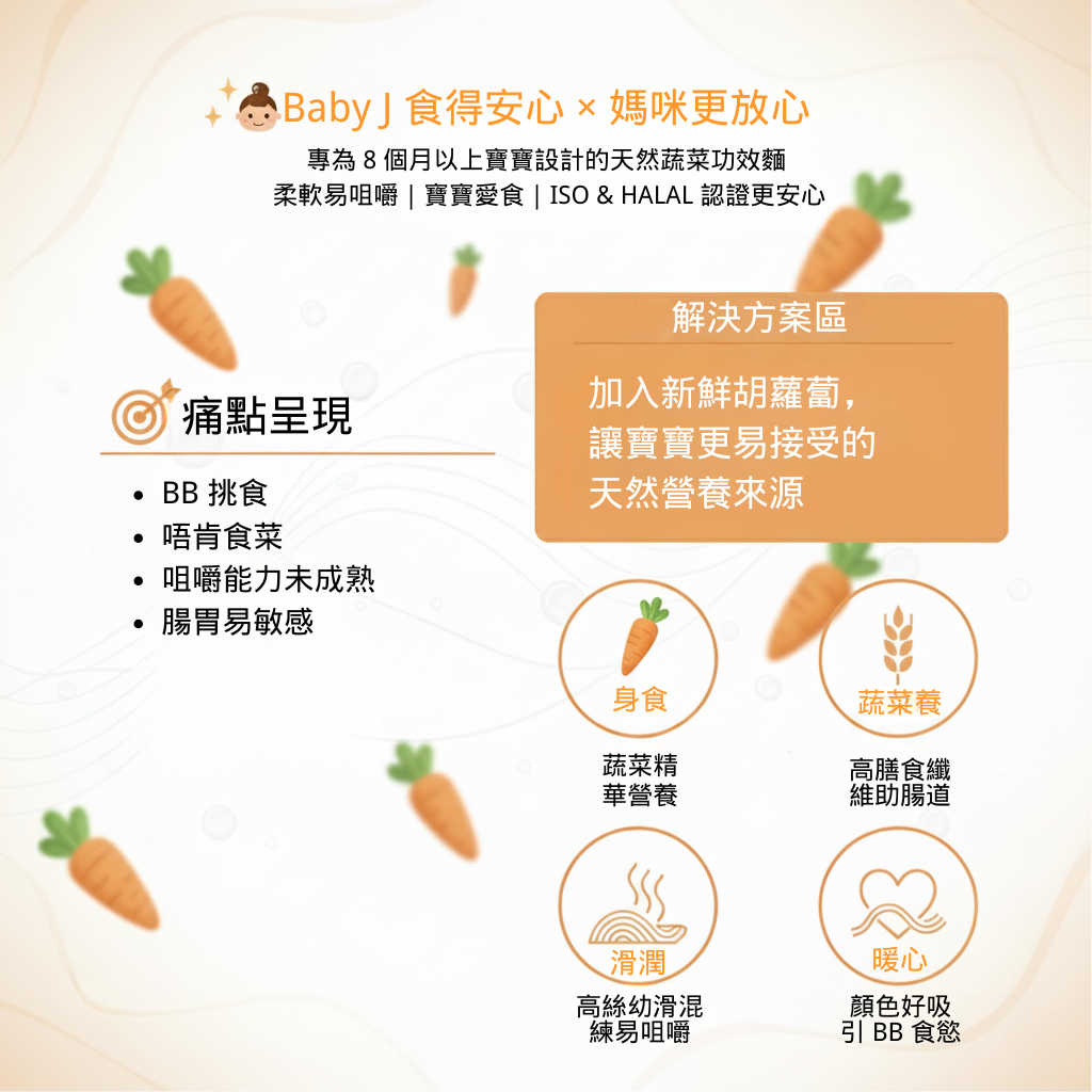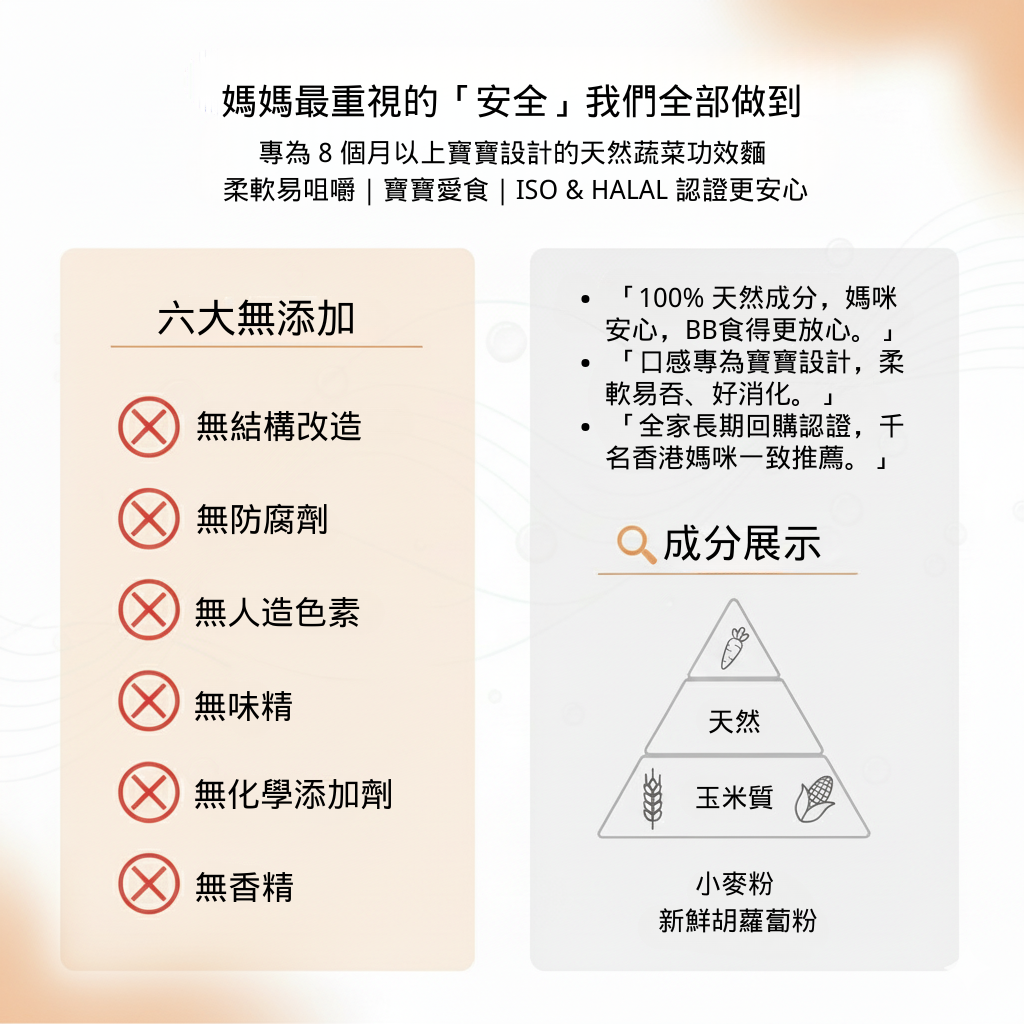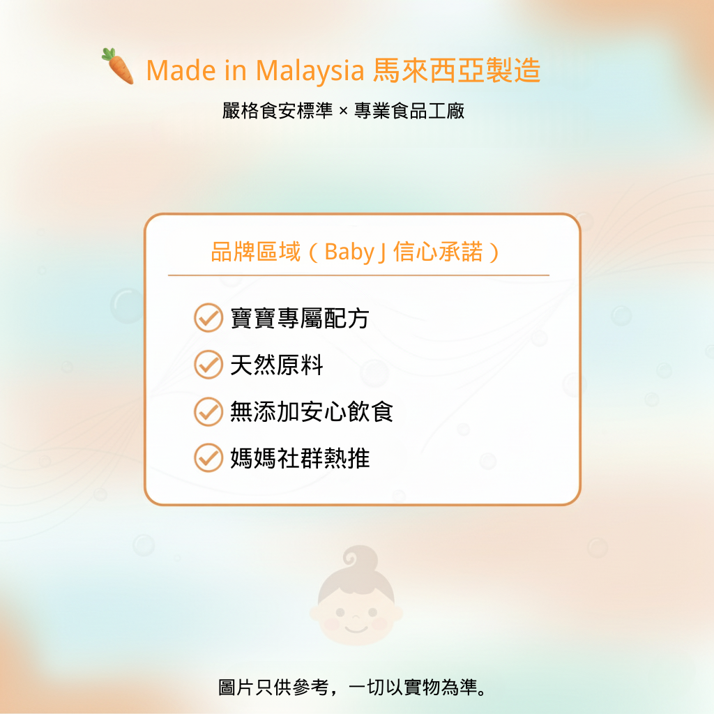 採用100%天然成分,加入新鮮蔬菜製造,含有豐富維生素和膳食纖維,對於挑食、少食以及不愛吃蔬菜的寶寶非常有益。不含基因改造、防腐劑、人造色素、食物添加劑,產品均通過ISO 22000:2005 品質認証 & HALAL清真認証,安全放心。