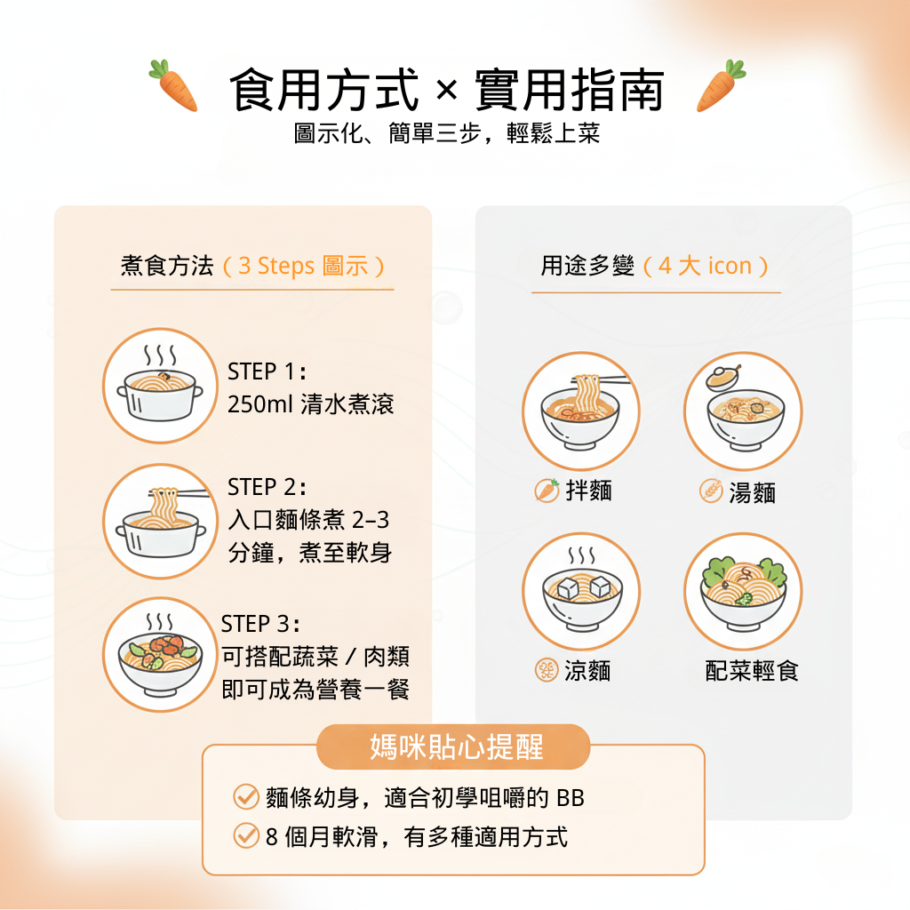 煮食方法:將約250毫升清水燒至沸騰,再將麵條放入約2-3分鐘後起鍋瀝乾水份,並加入各式的配菜,可用於伴麵、涼麵、湯麵等等。