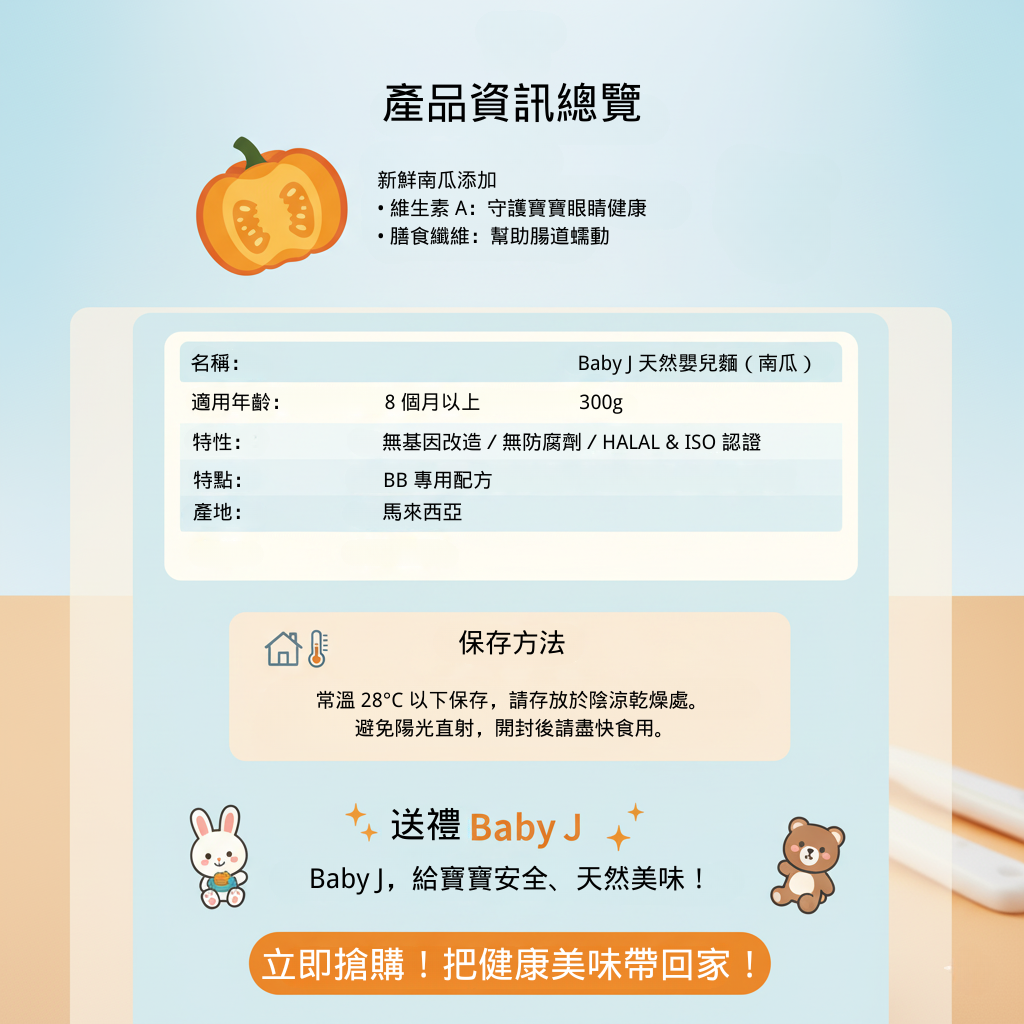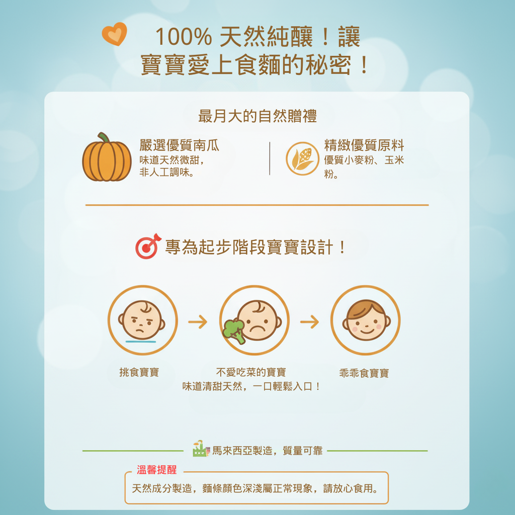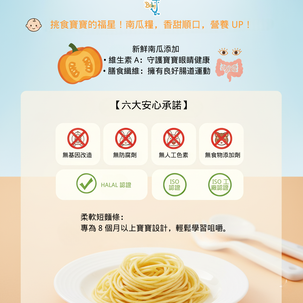 採用100%天然成分,加入新鮮蔬菜製造,含有豐富維生素和膳食纖維,對於挑食、少食以及不愛吃蔬菜的寶寶非常有益。不含基因改造、防腐劑、人造色素、食物添加劑,產品均通過ISO 22000:2005 品質認証 & HALAL清真認証,安全放心。