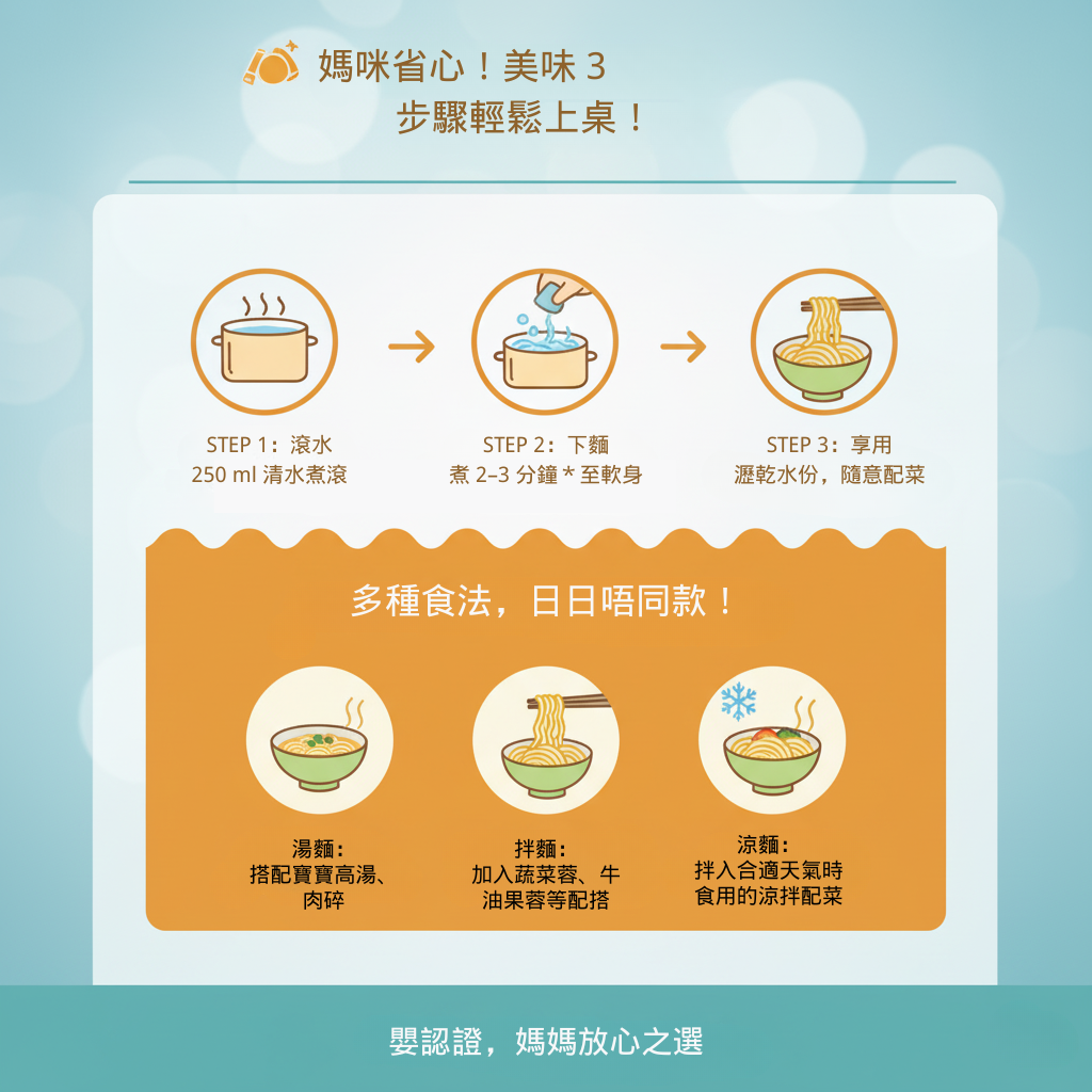 煮食方法:將約250毫升清水燒至沸騰,再將麵條放入約2-3分鐘後起鍋瀝乾水份,並加入各式的配菜,可用於伴麵、涼麵、湯麵等等。