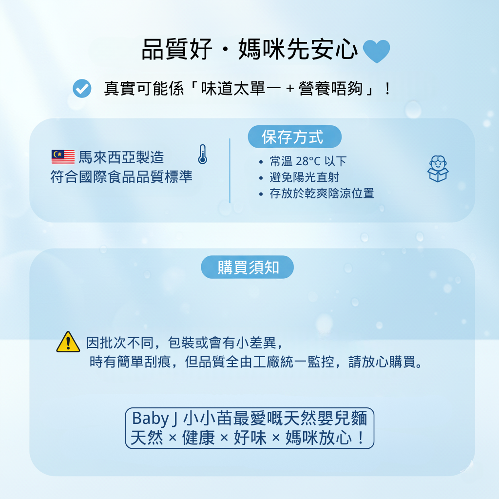 採用100%天然成分,加入新鮮蔬菜製造,含有豐富維生素和膳食纖維,對於挑食、少食以及不愛吃蔬菜的寶寶非常有益。不含基因改造、防腐劑、人造色素、食物添加劑,產品均通過ISO 22000:2005 品質認証 & HALAL清真認証,安全放心。