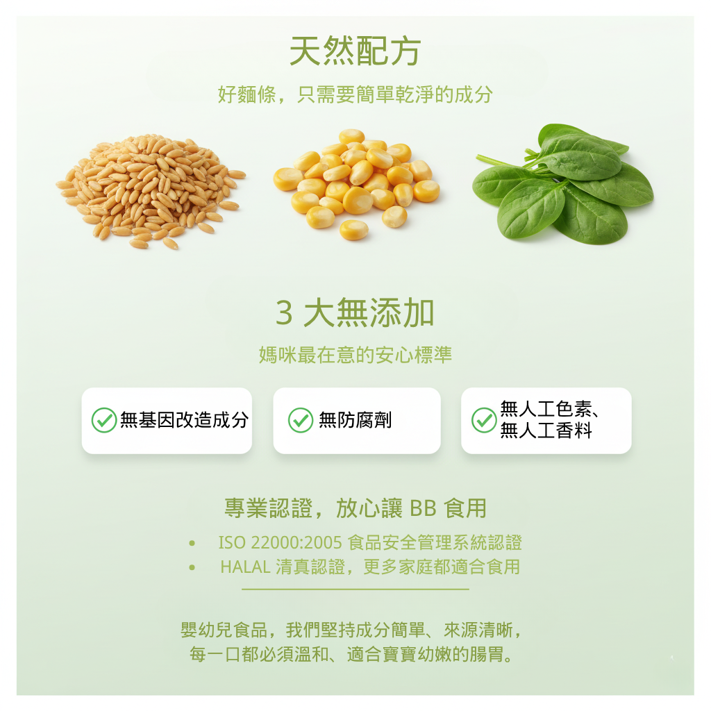 採用100%天然成分,加入新鮮蔬菜製造,含有豐富維生素和膳食纖維,對於挑食、少食以及不愛吃蔬菜的寶寶非常有益。不含基因改造、防腐劑、人造色素、食物添加劑,產品均通過ISO 22000:2005 品質認証 & HALAL清真認証,安全放心。
