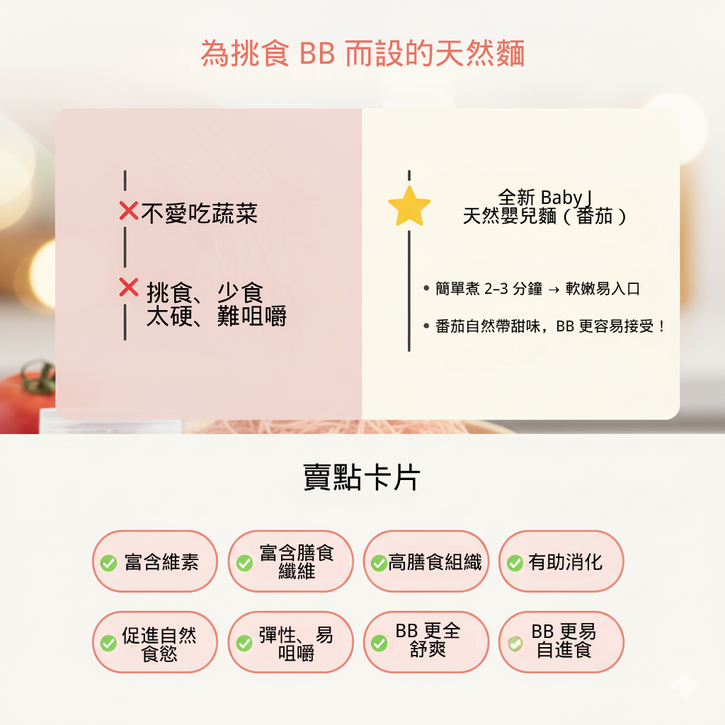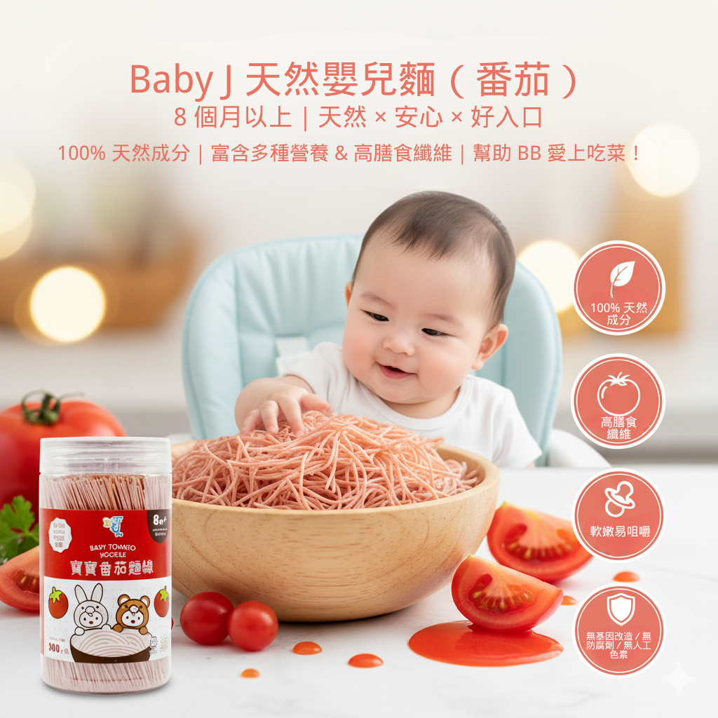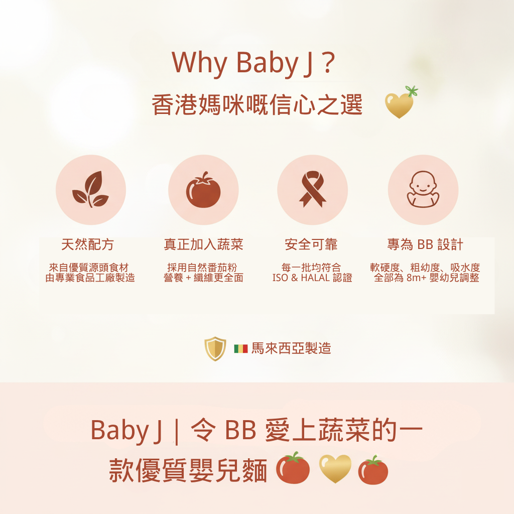 採用100%天然成分,加入新鮮蔬菜製造,含有豐富維生素和膳食纖維,對於挑食、少食以及不愛吃蔬菜的寶寶非常有益。不含基因改造、防腐劑、人造色素、食物添加劑,產品均通過ISO 22000:2005 品質認証 & HALAL清真認証,安全放心。