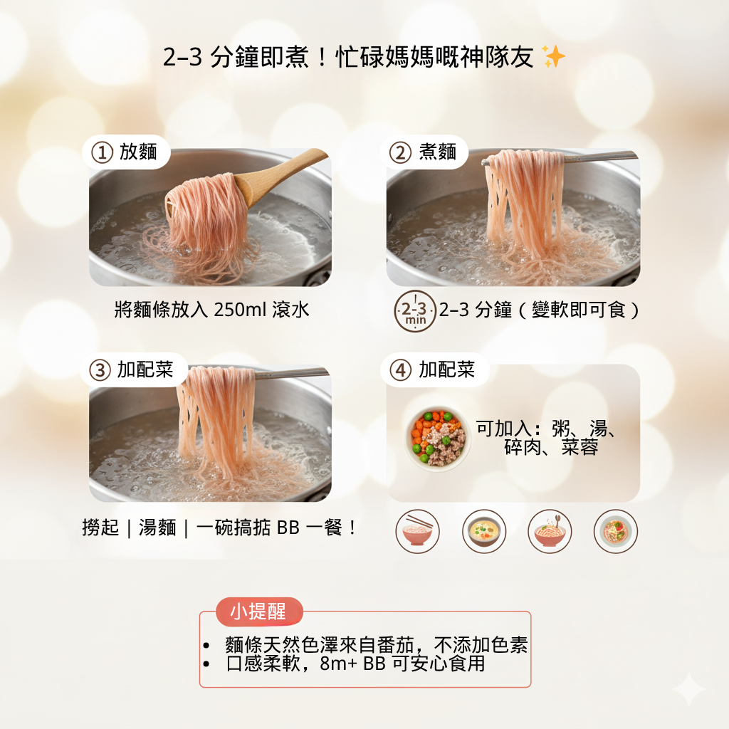 煮食方法:將麵條放入250毫升滾水中,煮約2-3分鐘後起鍋,並加入各式的配菜,可用於拌麵、涼麵、湯麵等等。