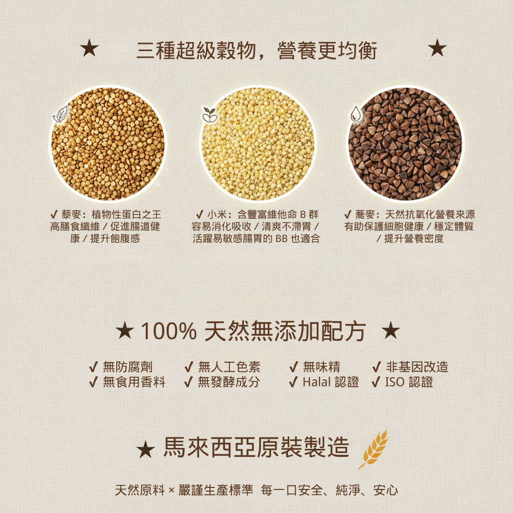 *本產品與其他含小麥、麩質、大麥、燕麥、大豆和芝麻的產品於同一生產線生產,食物過敏者請留意。