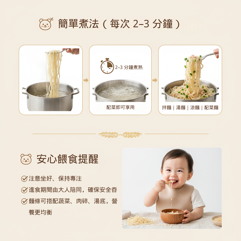 煮食方法:將麵條放入250毫升滾水中,煮約2-3分鐘後起鍋瀝乾水份,並加入各式的配菜,可用於拌麵、涼麵、湯麵等等。