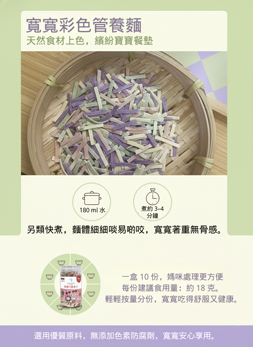 成份:小麥粉, 菠菜,番茄,南瓜粉,紫薯粉,紅麴米