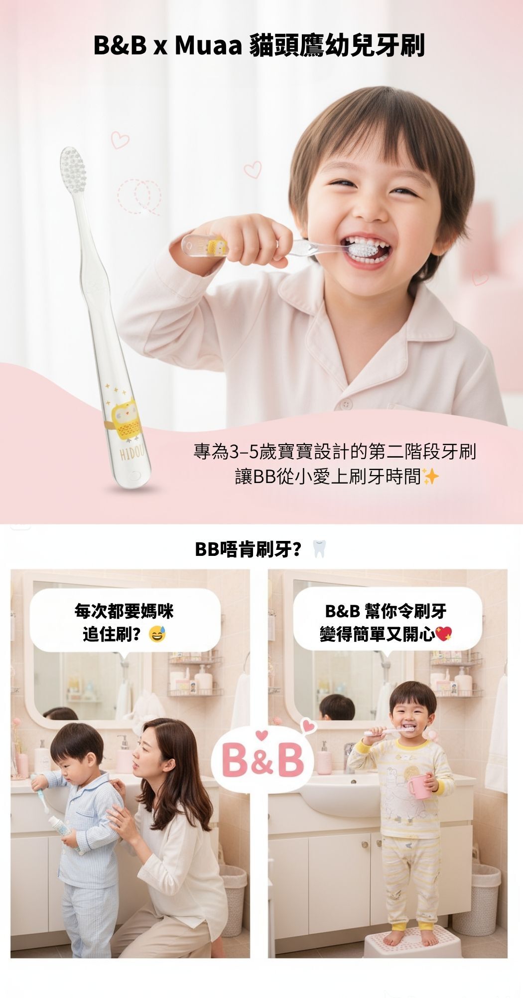 ✅ 解決方案:B&B x Muaa 第二階段牙刷專為 3–5 歲幼兒設計,柔軟抗菌刷毛溫和潔淨,貓頭鷹造型令BB愛上每日刷牙~從細養成好習慣🦷