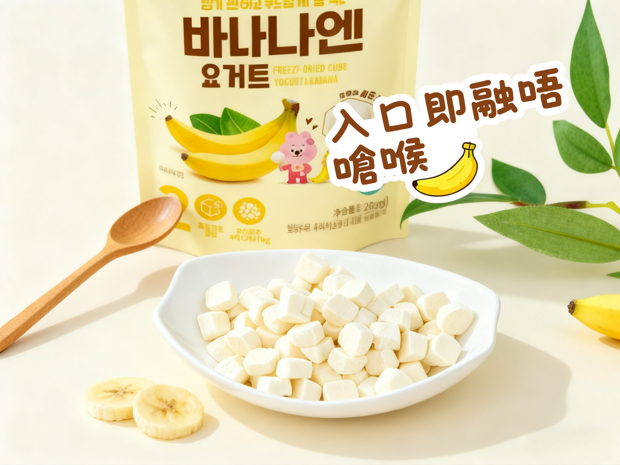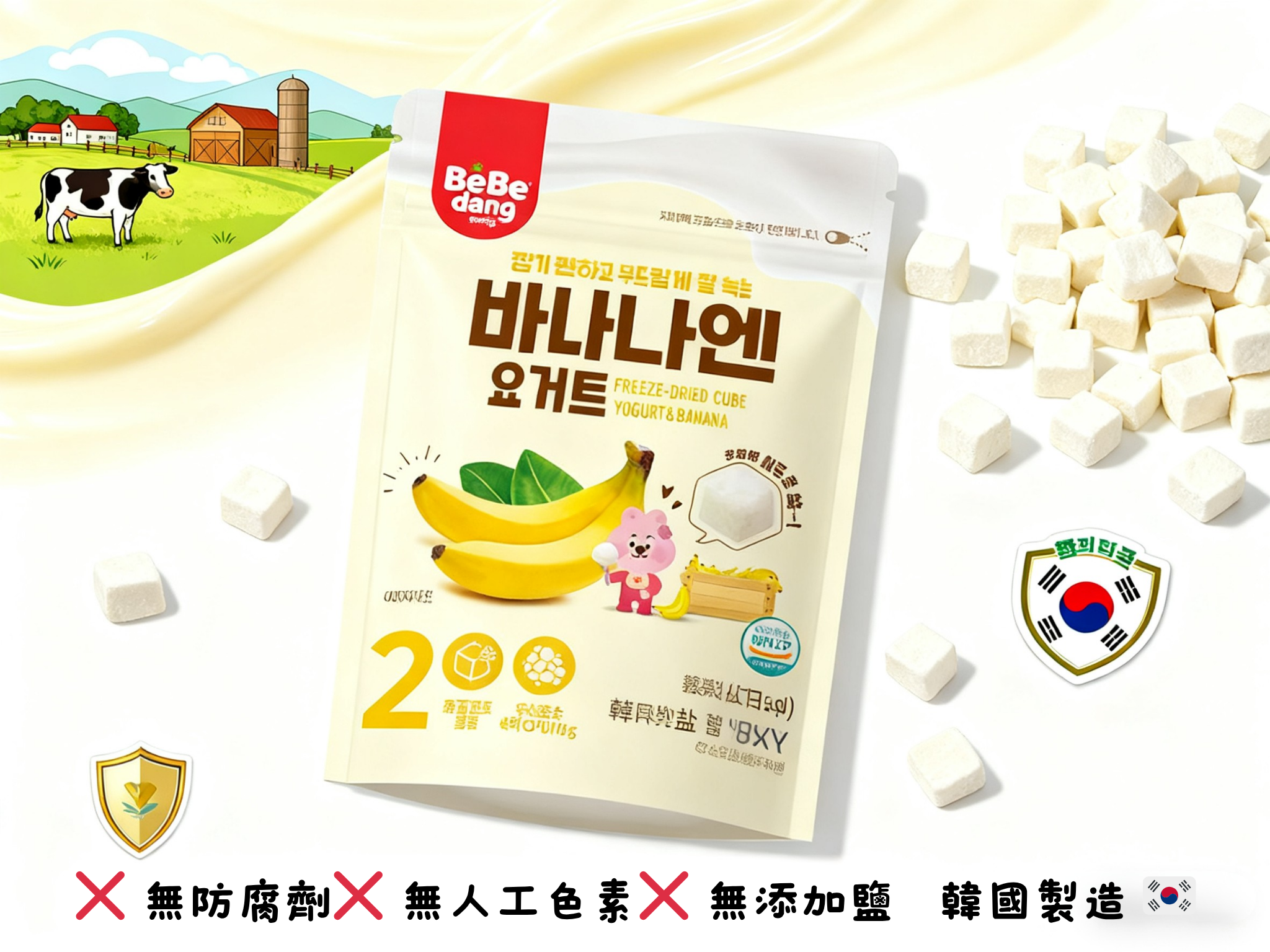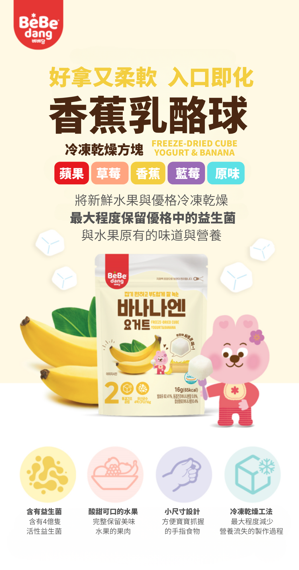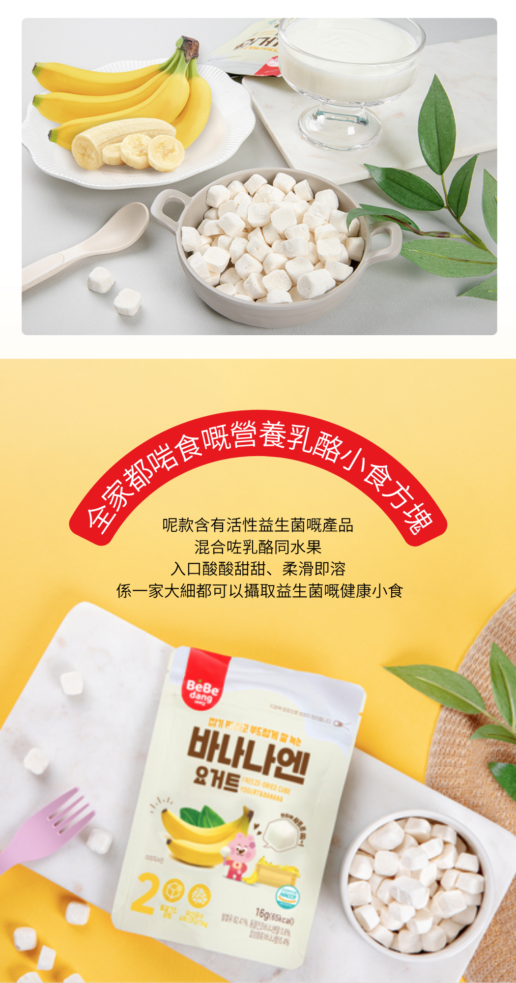 使用尖端 冷凍乾燥技術,完整保留乳酪嘅益生菌同營養。 結合 韓國牛奶 + 香蕉果肉,香滑濃郁、入口即化,細細粒啱晒 BB 練習手抓食。