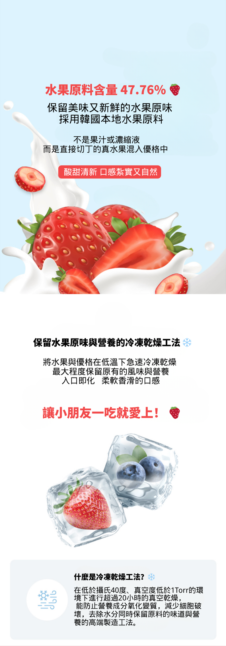 • 成分特色:乳酪、韓國水果、牛奶、益生菌