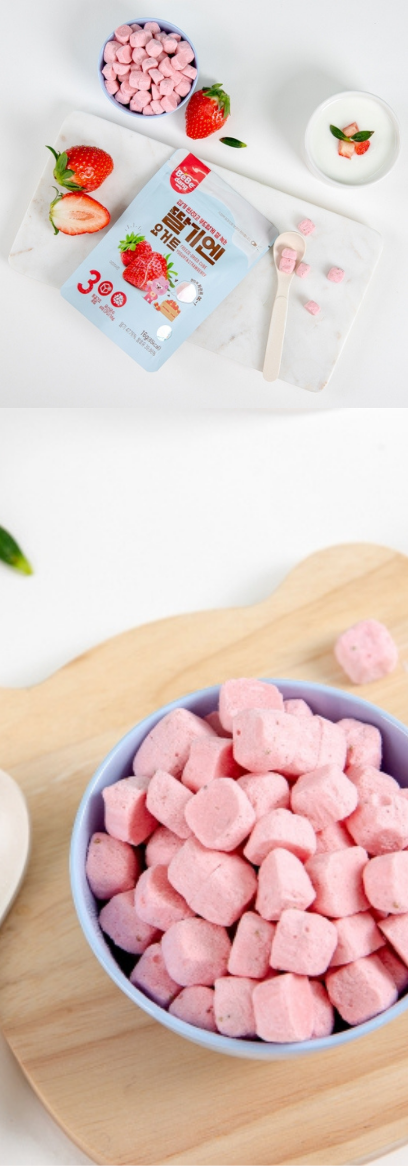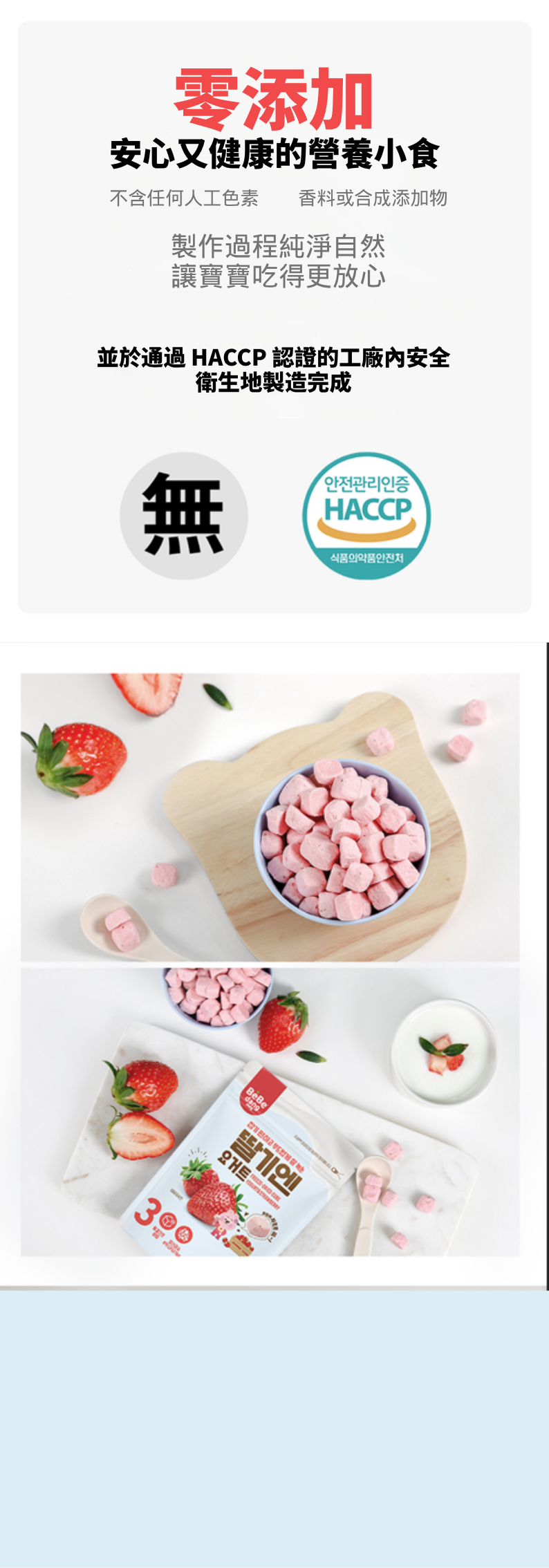 使用尖端的 冷凍乾燥技術,完整保留乳酪原有風味與營養,結合 韓國水果及牛奶,香氣濃郁、入口即溶。 特別設計 方塊形狀,能刺激 BB 嘅視覺與手部協調,訓練小肌肉同時享受美味!