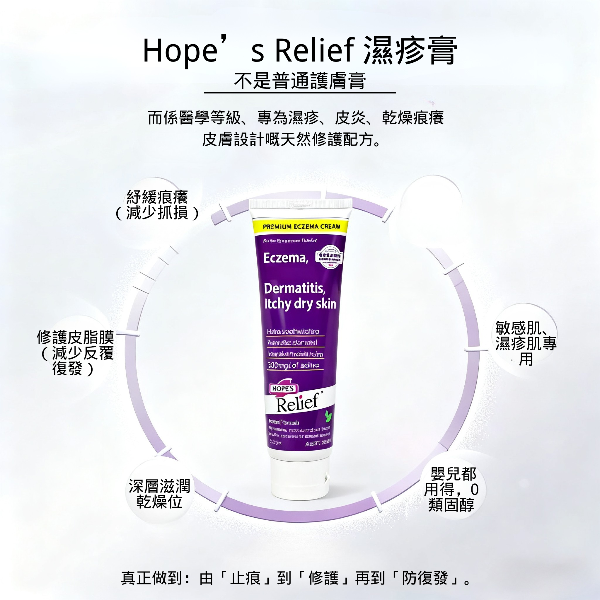 燕麥膠已被科學證實能令皮膚上產生一個皮膚保護膜,能鎖水滋養乾燥皮膚,含有抗癢性能。Hope’s Relief 含有燕麥膠和9個額外的天然皮膚保濕鎖水止癢成份。