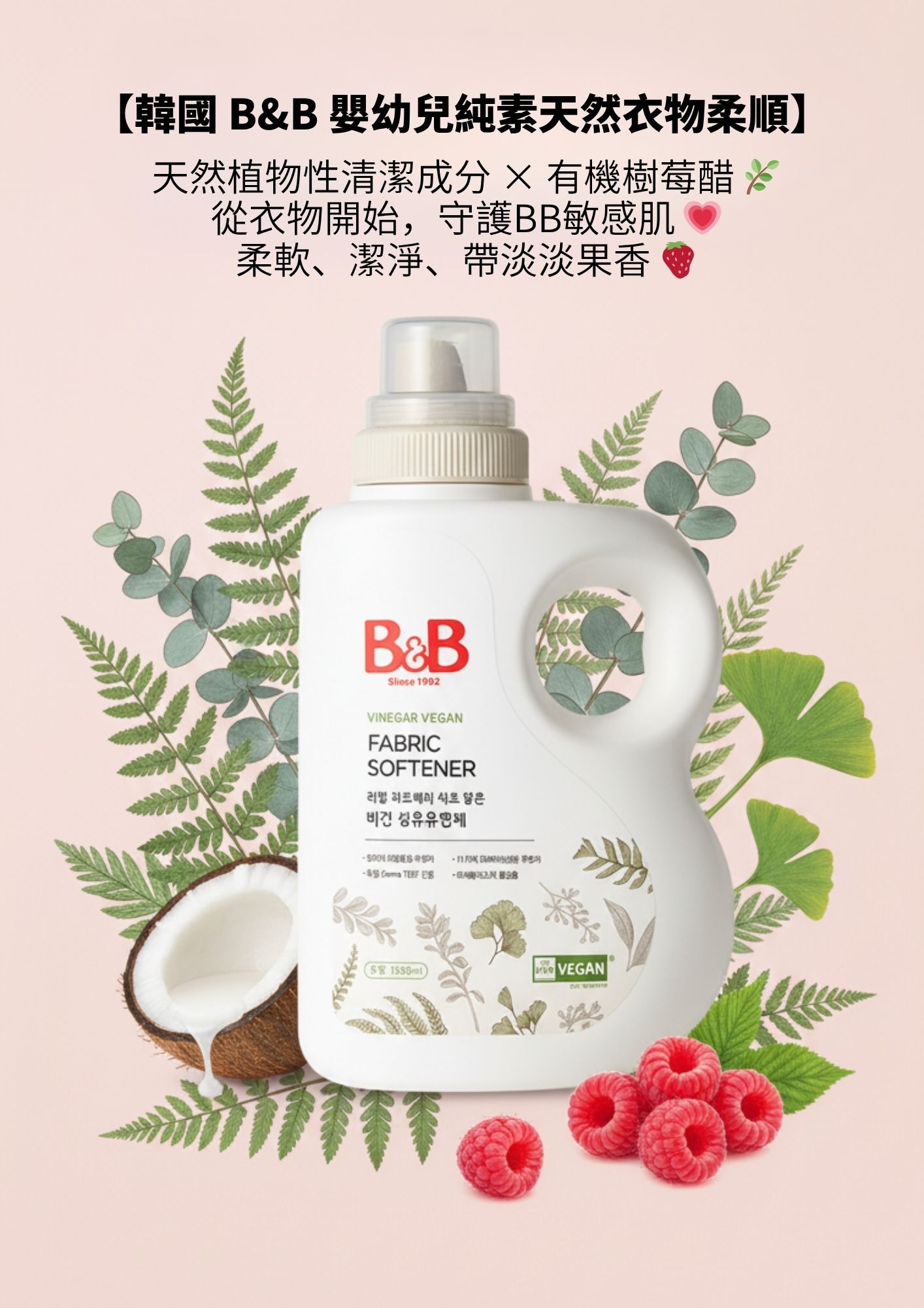 ✅ 解決方案:B&B純素天然柔順劑以 植物性配方 為主,使用 有機樹莓醋+椰子提取表面活性劑,有效柔軟纖維同時抑菌抗氧化,BB衣服柔順得嚟又唔刺激皮膚💧