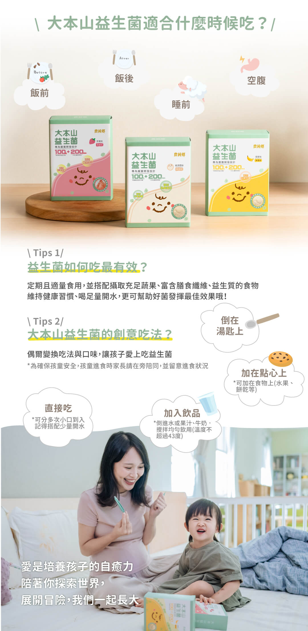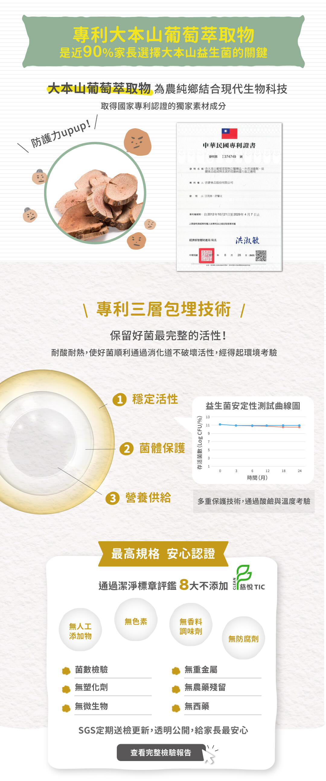 成分亮點:大本山七益菌(標示菌株編碼)+大本山葡萄萃取物(專利)+石莼多醣;部分口味添加 乳鐵蛋白;粉狀設計,易拌水或食物。