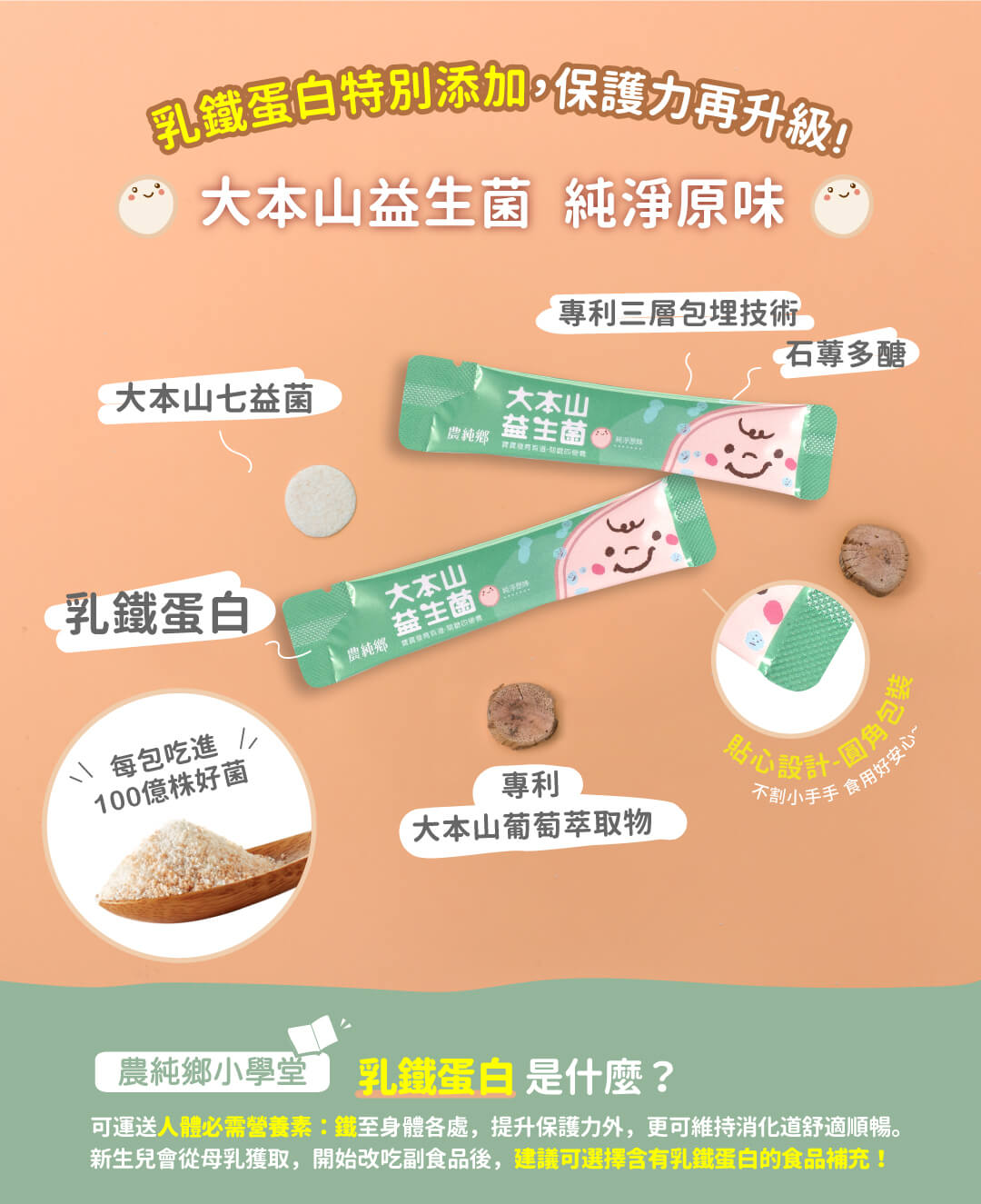 ✅ 農純鄉《大本山益生菌》:七益菌+乳鐵蛋白、專利三層包埋、通過潔淨標章、8 大不添加;每日一包,輕鬆建立好習慣。