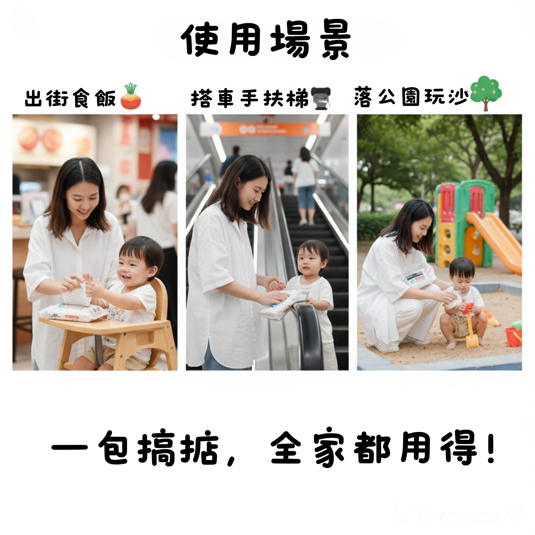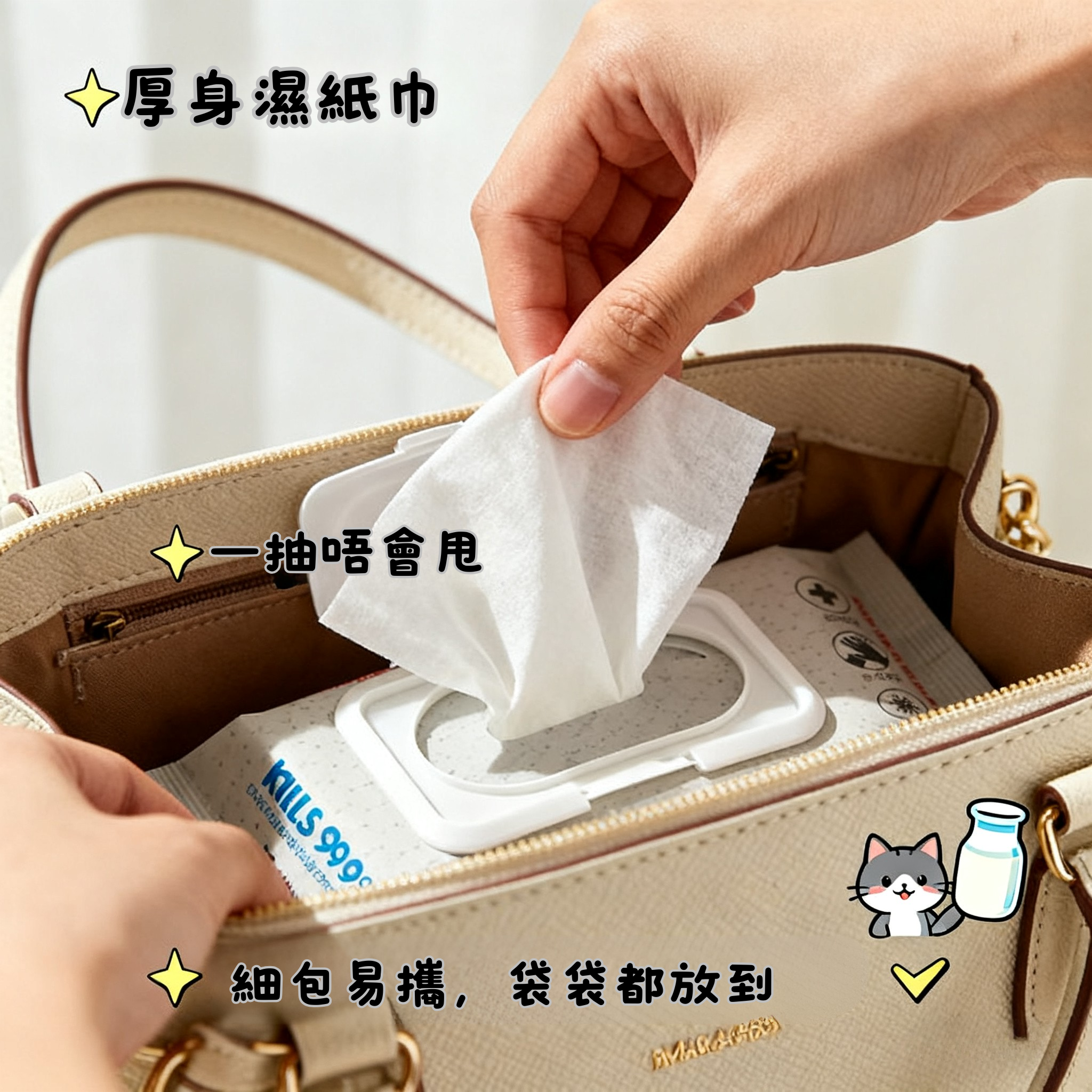 • 外出時用濕紙巾擦手、擦手機、餐具最方便。