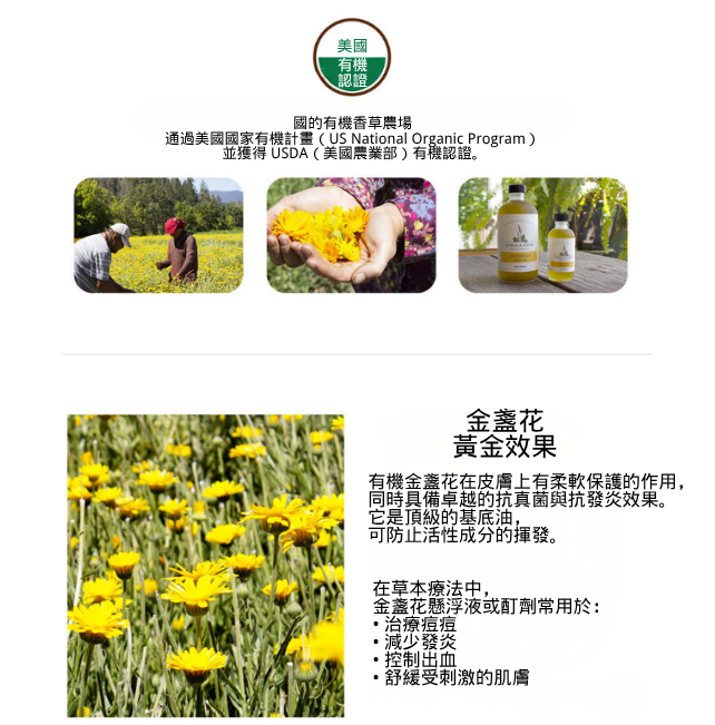 使用來自美國農業部認證農場的金盞花油,可作為皮膚軟化劑,並具有出色的抗真菌和抗炎特性。