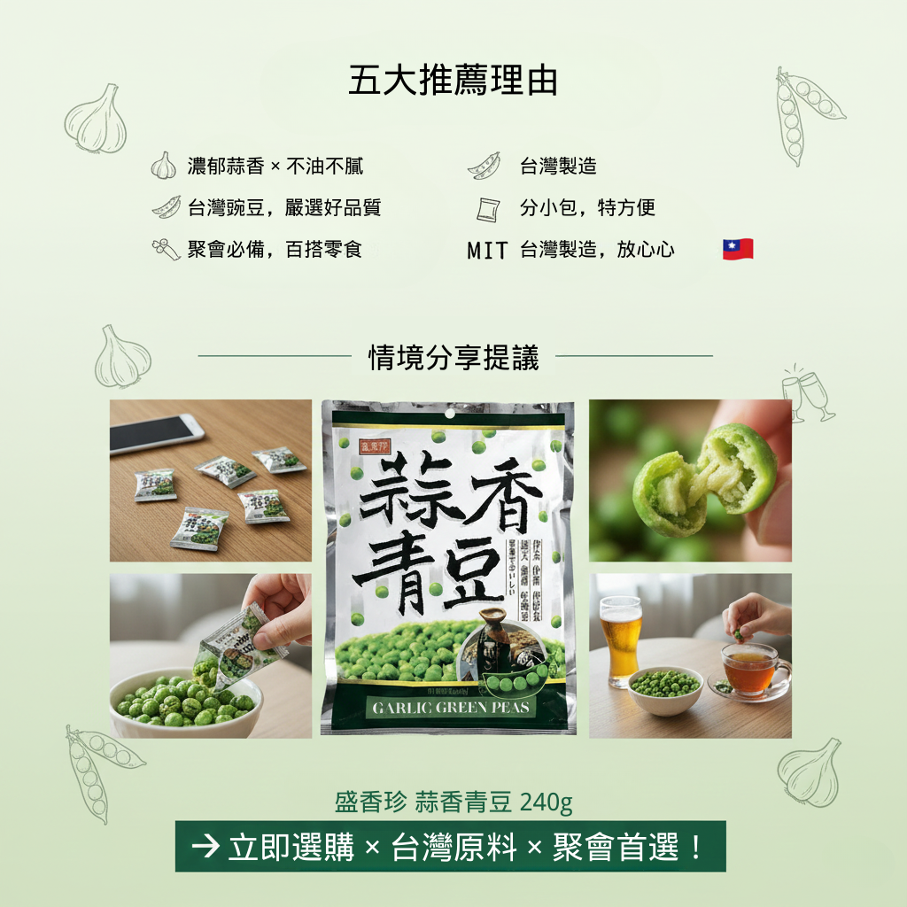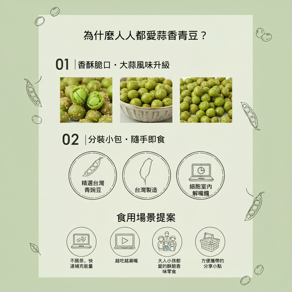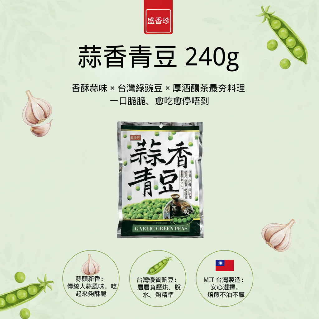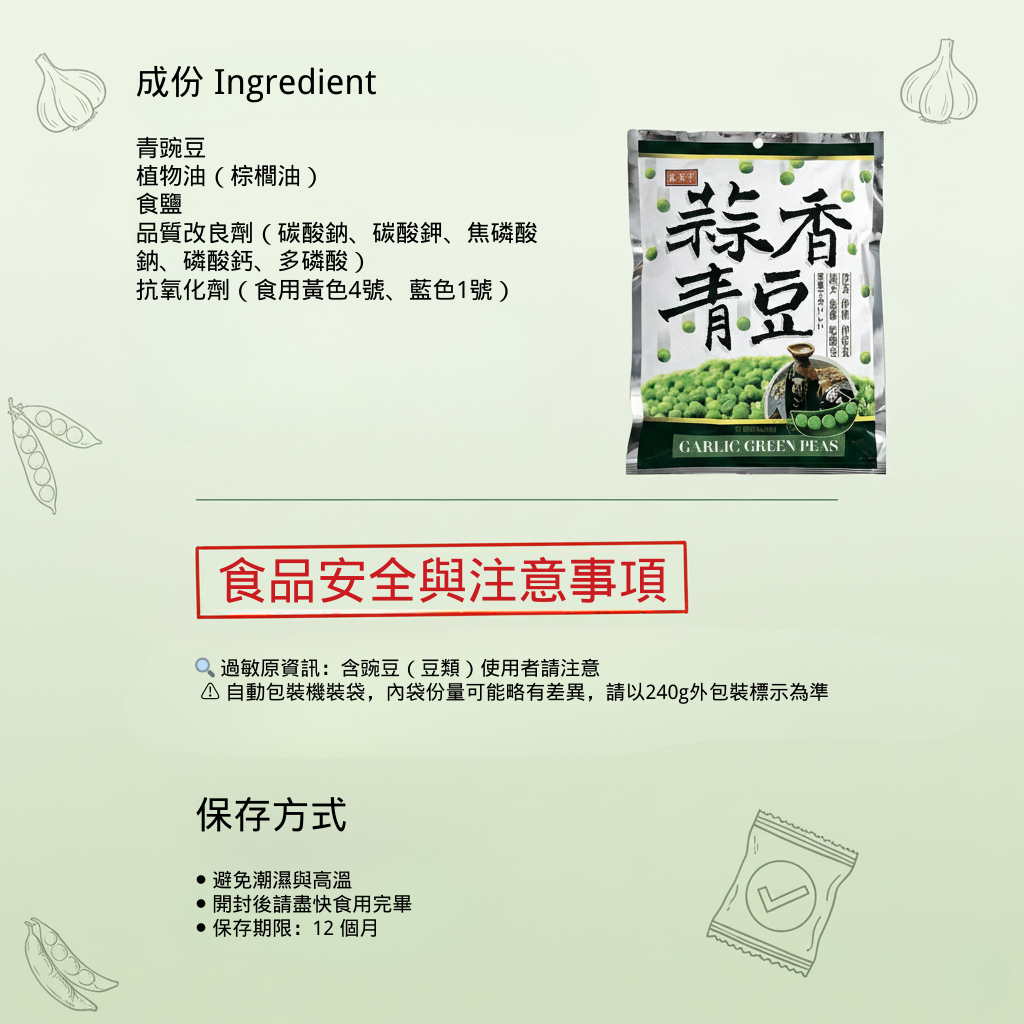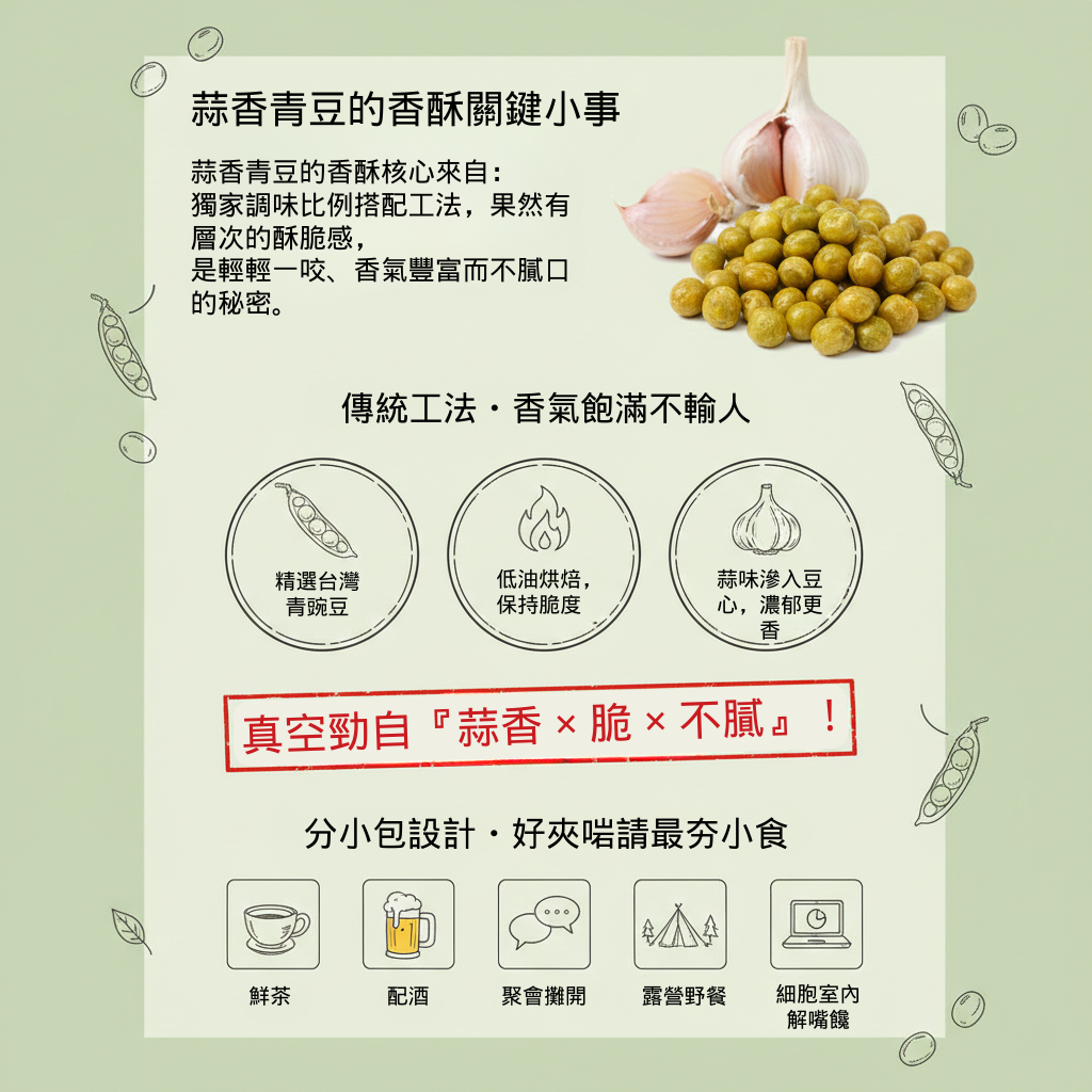 ★豌豆為一年生攀援草本植物,豌豆仁含蛋白質、脂肪、碳水化合物等營養素。蒜香青豆,結合傳統大蒜香味經特殊衛生烘焙融入酥脆豌豆裡,香酥順口,好友相聚、品茶、喝酒極佳佐食。