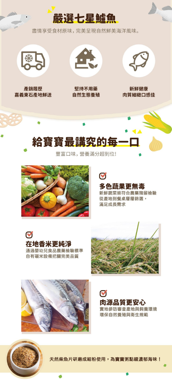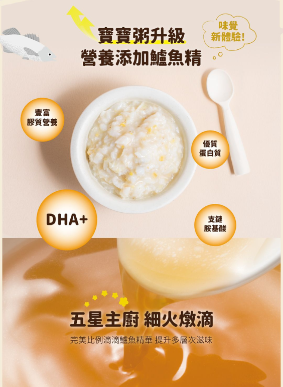 ・採用產銷履歷七星鱸魚,再加鱸魚精,將魚肉營養同精華都鎖喺一包粥入面;