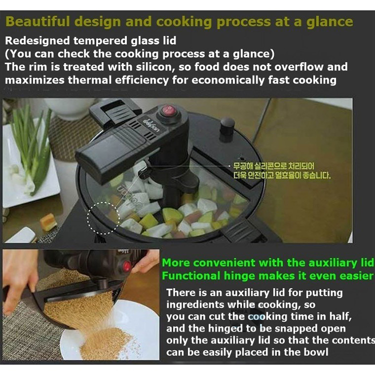 * Put the ingredients and just turn on the power-Without worrying about oil splashing-No Smell-No need to stir hard in front of a hot fireFry, stir, turn over, and bake evenly.